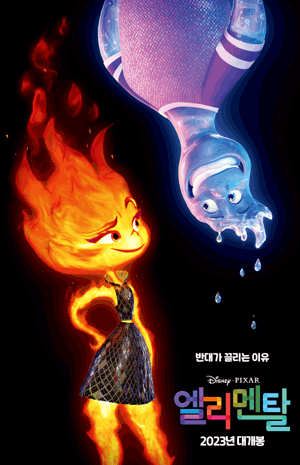 디즈니 픽사가 새로 제작하는 영화 <엘리멘탈>은 이미 포스터부터 기발한 설정으로 특이하다. 열정적인 불의 모습의 여자와 거꾸로 매달린 물의 이미지 남자가 서로를 마주 보고 있다. 절대 서로 섞일 수 없는 불과 물은 그럼에도 서로에게 끌린다. 세상에 있는 모든 원소들에게 생명력을 넣은 애니메이션이다. 이들이 사는 세계는 '엘리멘트 시티'이다. 제작 단계서부터 기발한 설정으로 뜨거운 기대를 모으고 있는 <엘리멘탈>은 2023년 6월 개봉 예정이다. 감독은 피터 손, 주연은 레아 루이스, 마무두 아티 이다. 피트 닥터 감독은 제작자로 참여했다.